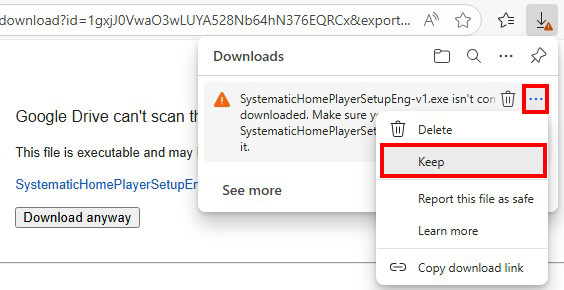 Note 1: If the message shown in the image below appears in the corner of your browser, you must click the "..." and select "Keep" to save the file: