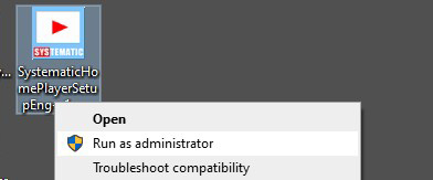 Right-click on the downloaded SystematicHomePlayerSetupEng-v1.exe file and select "Run as administrator" to begin installation.